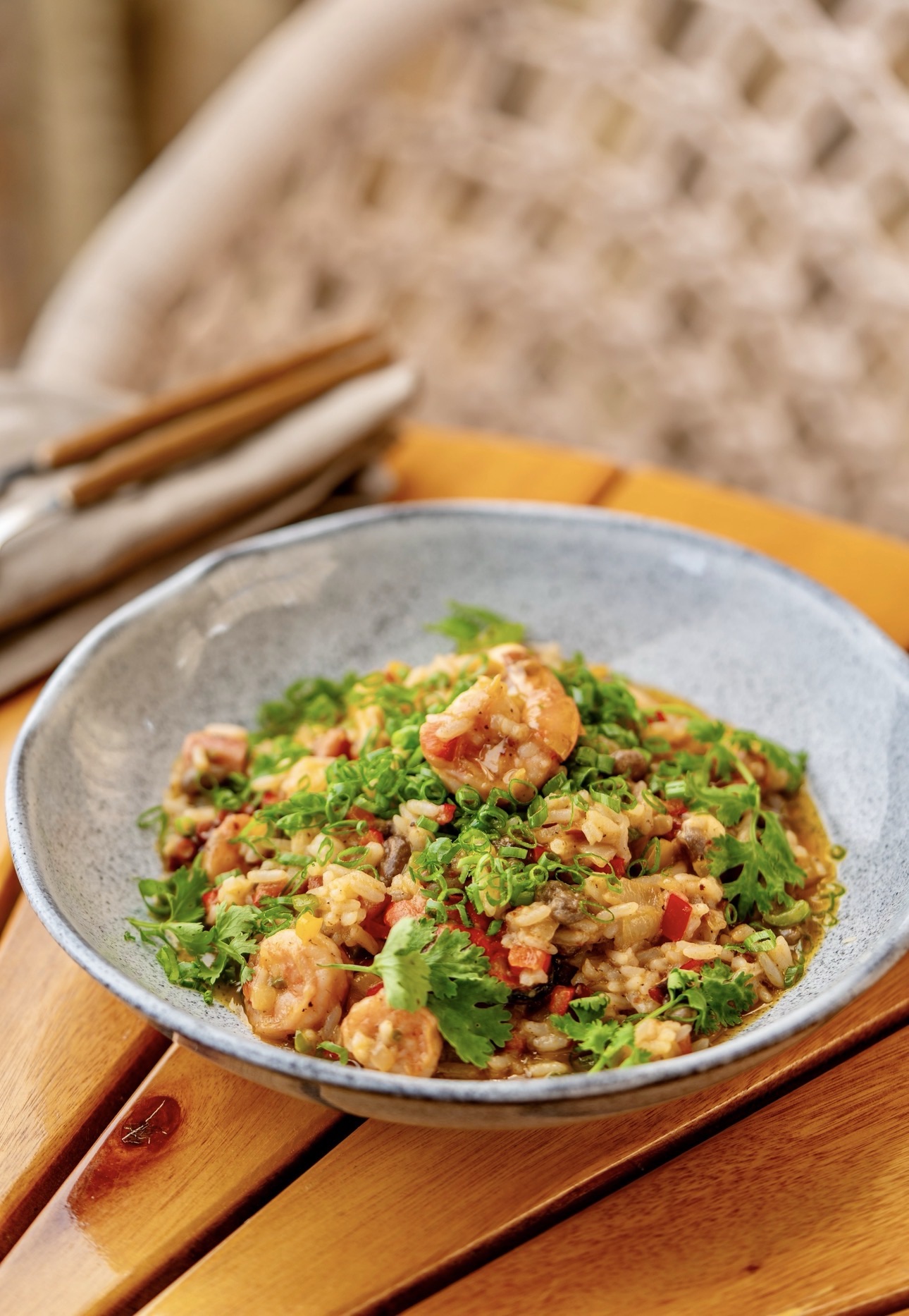Entre os destaques do menu está o Baião de Frutos do Mar, releitura do tradicional baião de dois. O prato é preparado com baião cremoso à base de feijão verde, bacon, queijo coalho e nata, enriquecido com caldo de crustáceos e combinado a ingredientes típicos do litoral, como mexilhão, lula, polvo e camarão. A finalização com cebolinha e coentro reforça os sabores característicos da culinária regional.